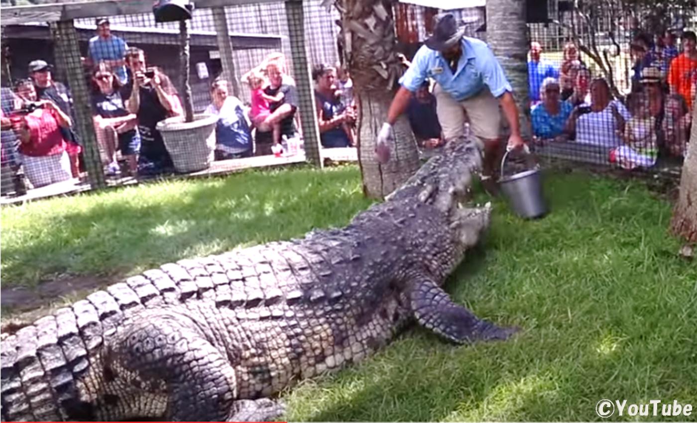 サウスカロライナ州にあるアリゲーター・アドベンチャーで飼育されいる、イリエワニとシャムワニの交雑種であるハイブリッド・クロコダイル。何でも、北米で飼育されているワニの中では、一番大きいのだとか。飼育員さんが餌付けをしております。